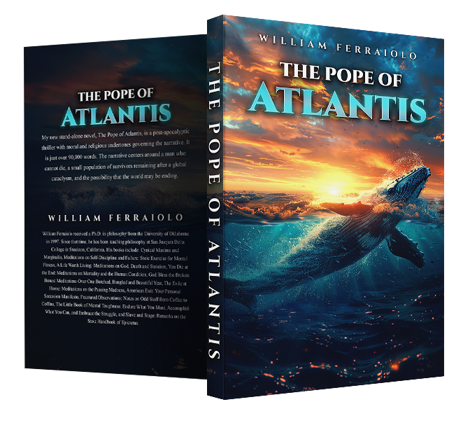 My new stand-alone novel, The Pope of Atlantis, is a post-apocalyptic thriller with moral and religious undertones governing the narrative. It is just over 90,000 words. The narrative centers around a man who cannot die, a small population of survivors remaining after a global cataclysm, and the possibility that the world may be ending.